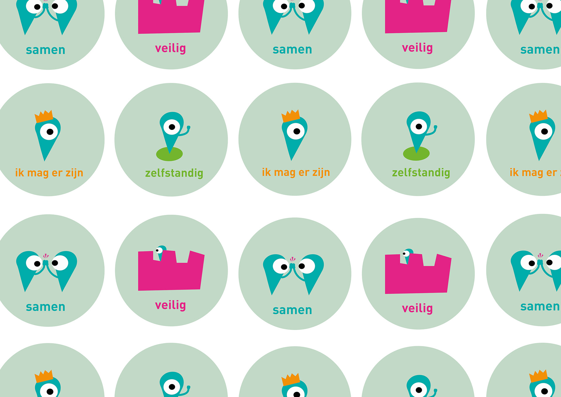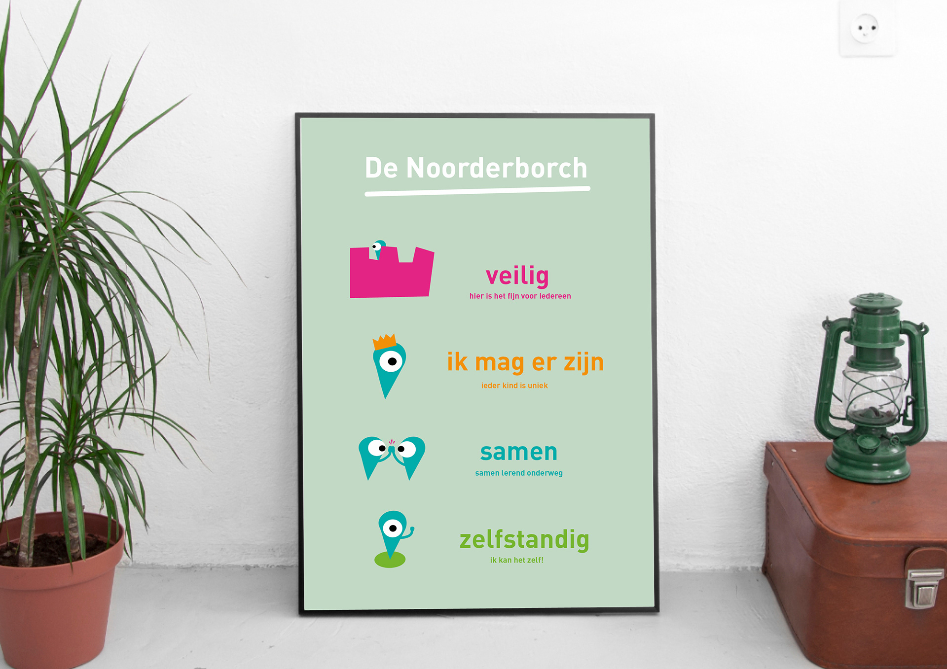 Some new work for de Noorderborch. A very openminded primary school. They wanted something that communicates their norms and values in a visual way that connects with the logo.