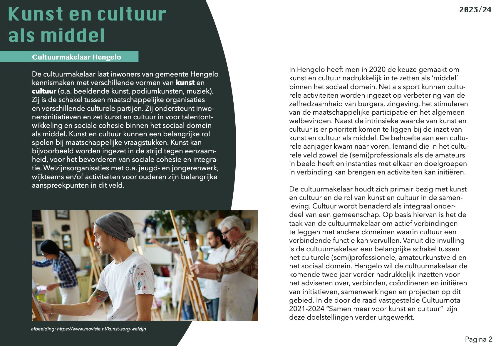 De cultuurmakelaar in de gemeente Hengelo heeft als taak om culturele activiteiten en initiatieven te stimuleren en te ondersteunen. De cultuurmakelaar werkt als verbinder tussen de verschillende culturele organisaties, kunstenaars en inwoners van de gemeente Hengelo en probeert zo een bloeiend cultureel klimaat te creëren. Concreet kan de cultuurmakelaar bijvoorbeeld helpen bij het opzetten van culturele projecten, het vinden van geschikte locaties voor culturele activiteiten en het leggen van contacten tussen kunstenaars en organisaties. Ook kan de cultuurmakelaar zich bezighouden met het vergroten van de participatie van inwoners bij culturele activiteiten en het versterken van de culturele identiteit van de gemeente Hengelo. Door de verschillende partijen met elkaar te verbinden en te stimuleren, draagt de cultuurmakelaar bij aan een levendige en diverse culturele sector in de gemeente Hengelo.